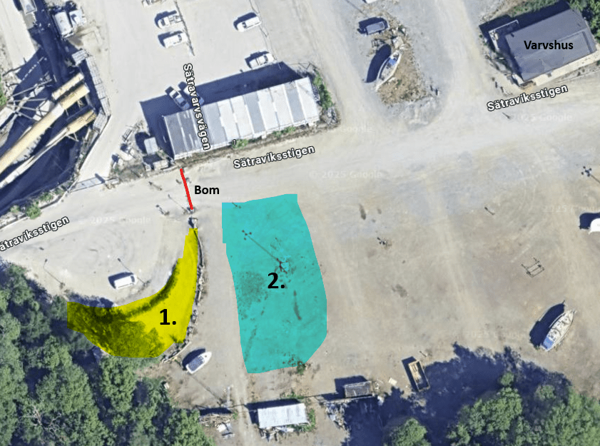 varvsområdet vid mån av plats (1) eller på markerad yta (2). - Område (2) kommer successivt att minskas för att ge plats åt båtuppställning.